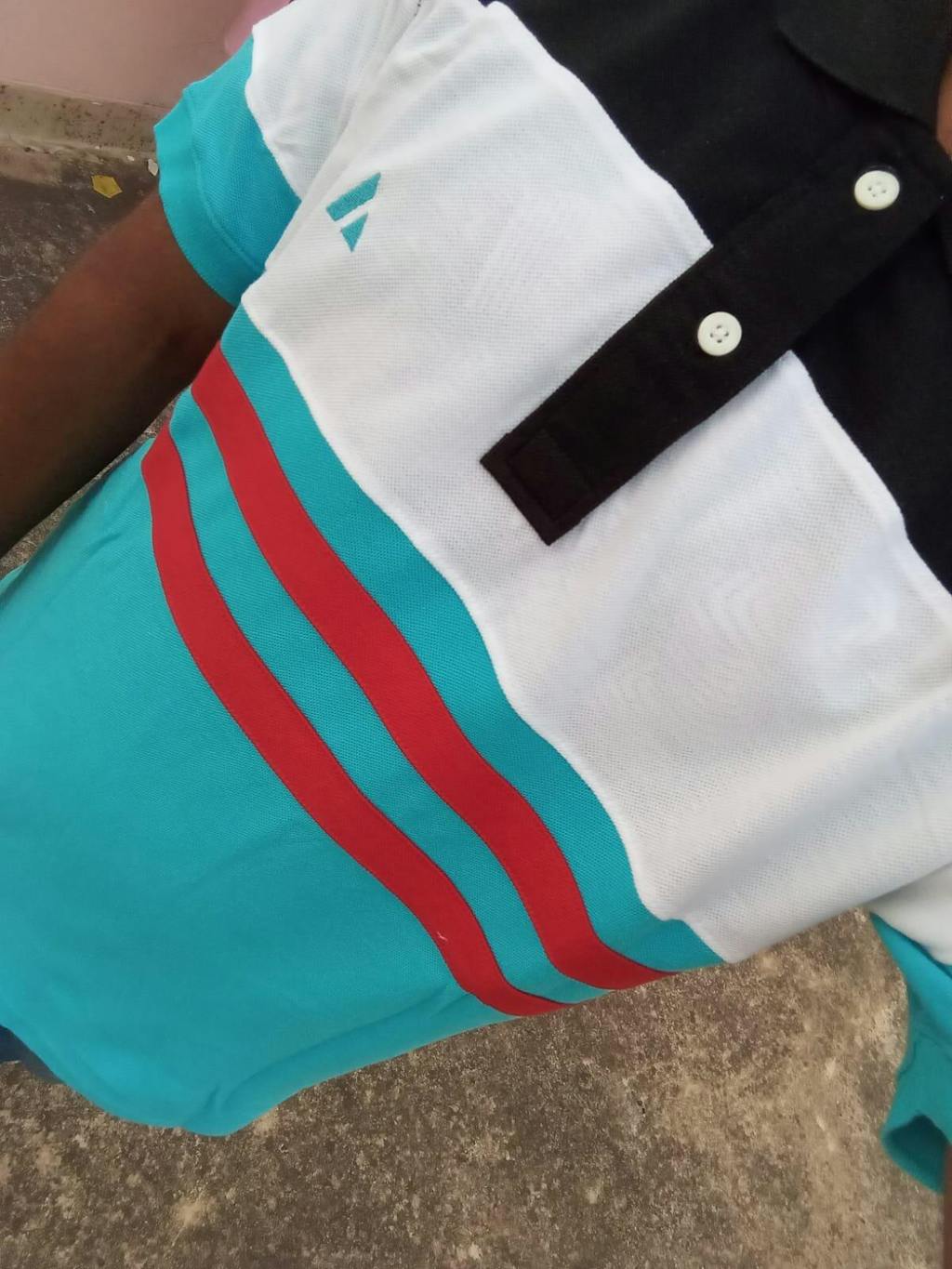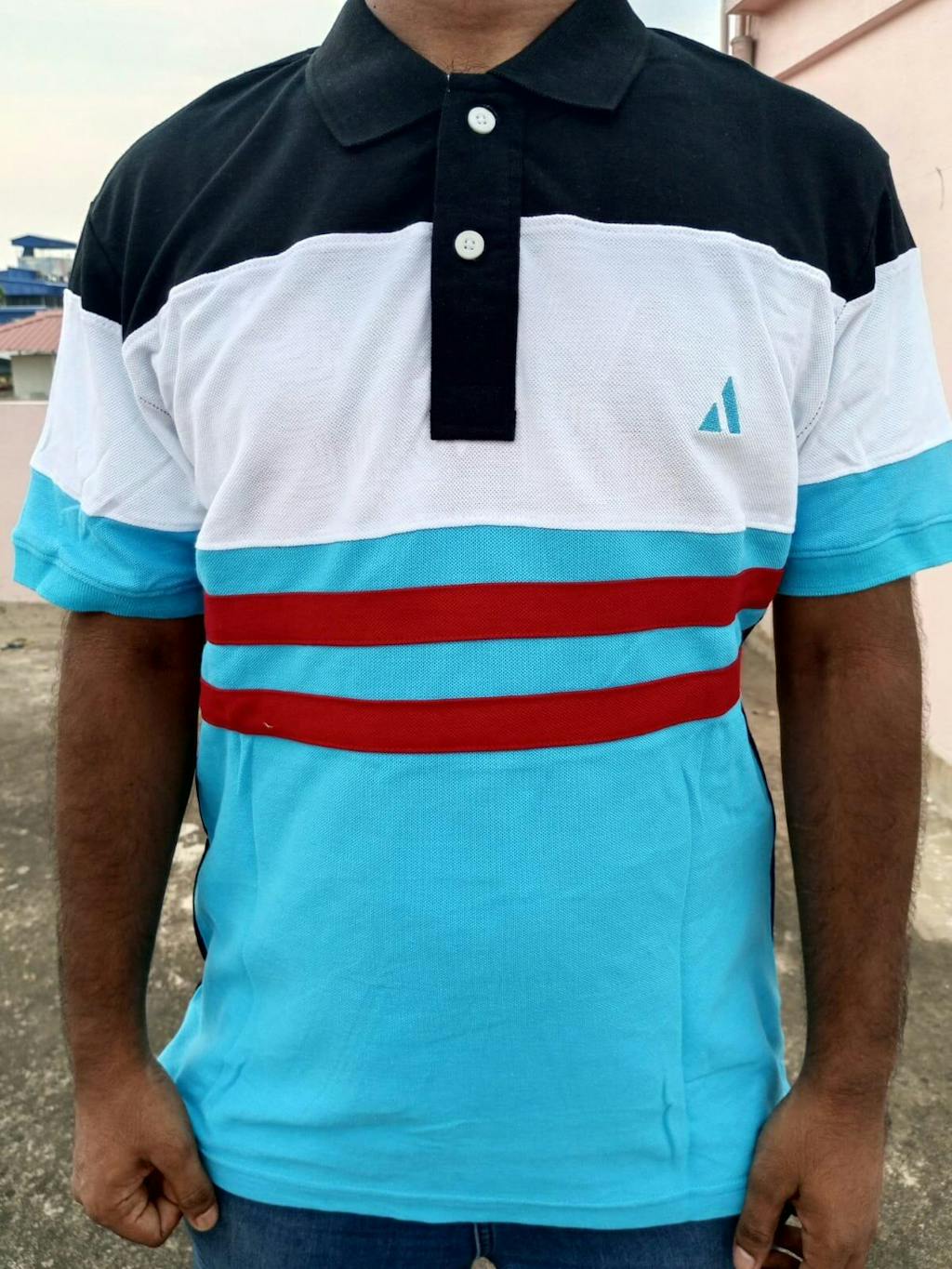 Black, White & Turquoise Blue Polo T-Shirt with Red Stripe