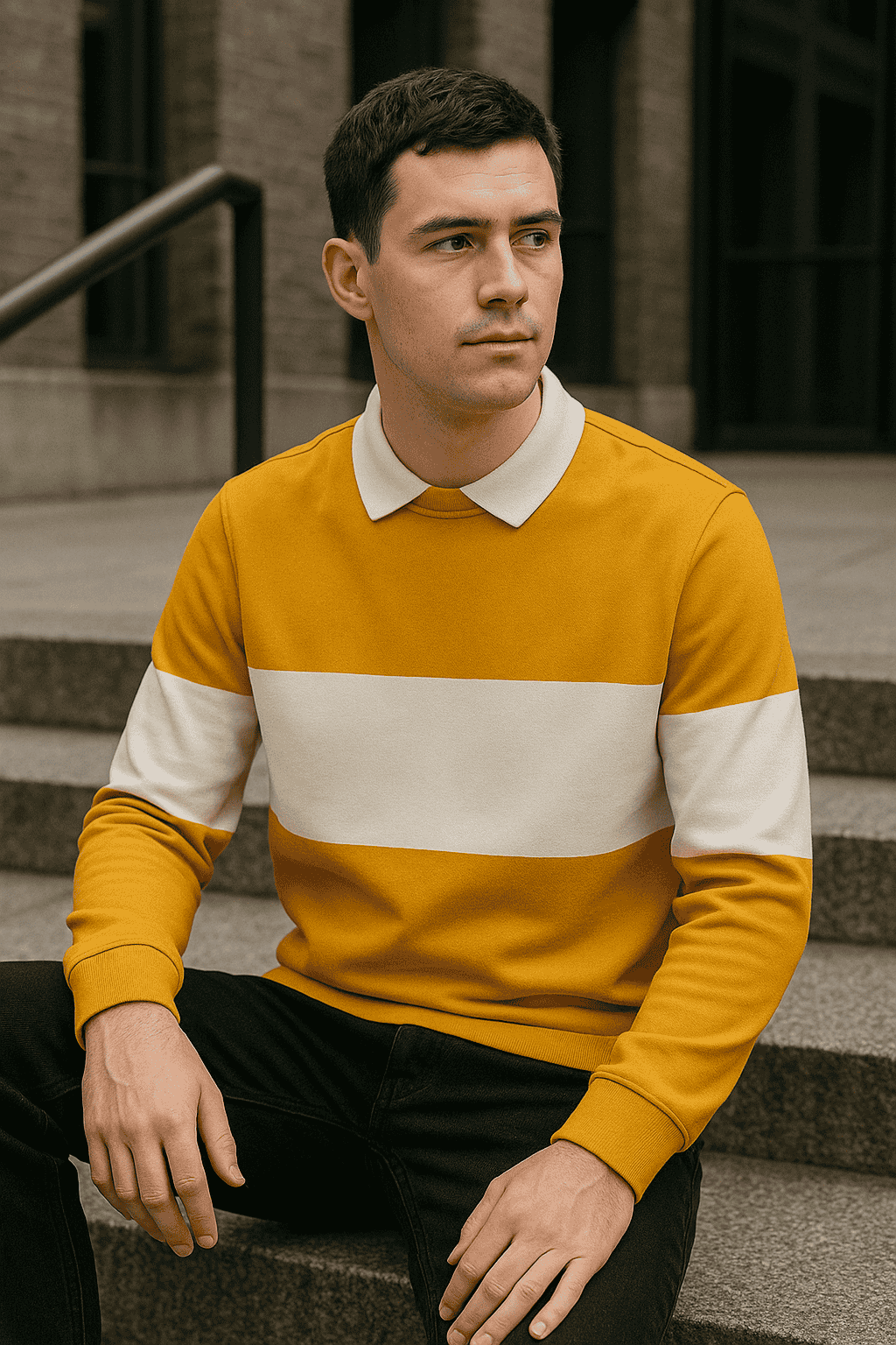 The mustard body paired with the white mid-stripe and sleeve accents offers a clean, striking design that stands out effortlessly. Its lightweight, breathable fabric ensures a relaxed fit while maintaining a polished look.