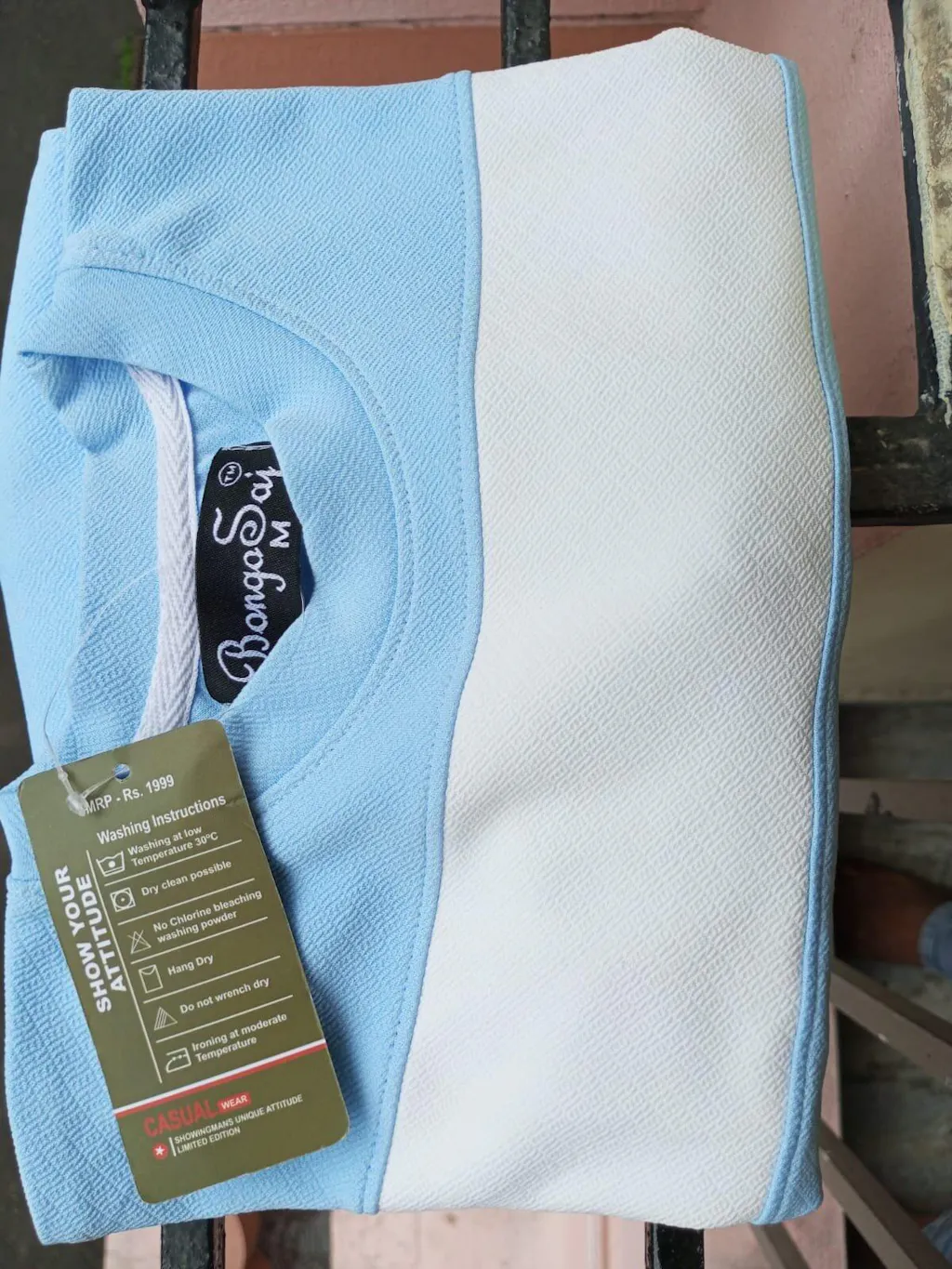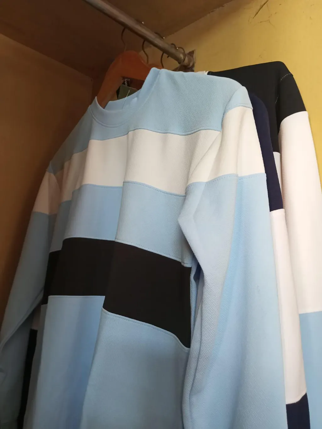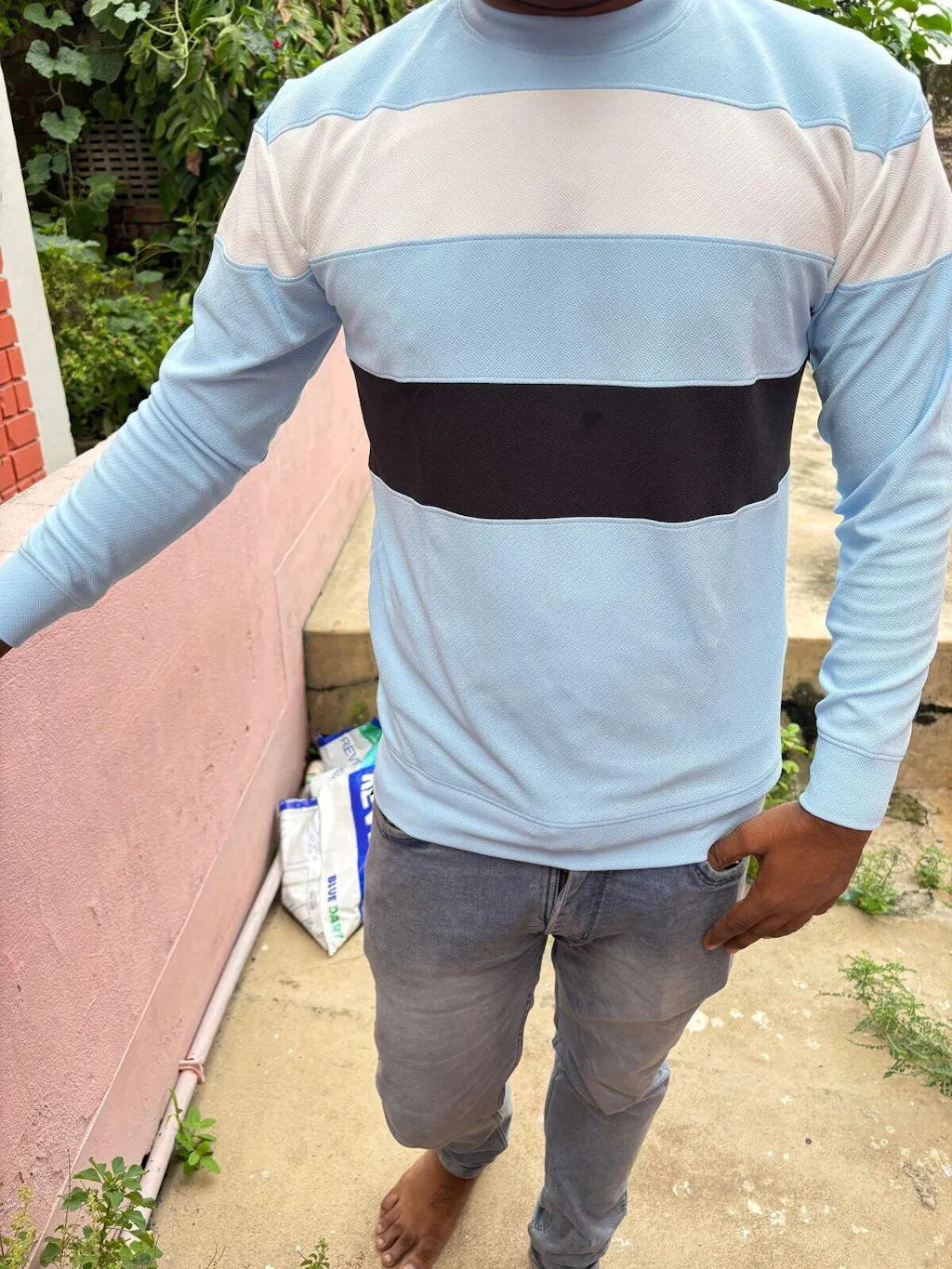 Explore our stylish full-sleeve t-shirts in Black, White, and Sky blue with a bold stripe design. Crafted from premium fabric for comfort and durability, these t-shirts are perfect for both casual and semi-formal occasions. Available in multiple sizes, they are versatile wardrobe staples. Elevate your style effortlessly with these modern, comfortable full-sleeve t-shirts.