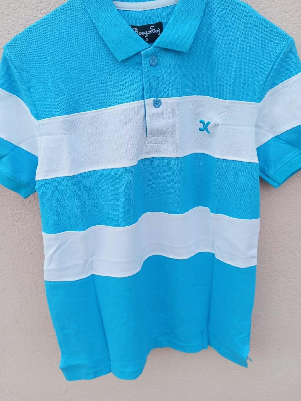 This white, blue, and turquoise polo T-shirt will update your outfit. This shirt provides unrivaled comfort and style because it is made of a quality cotton mix. Perfect for both semi-formal and casual situations, the classic polo pattern is enhanced by the vibrant color scheme. Anybody wishing to improve their everyday appearance should own this shirt, which comes in a variety of sizes.